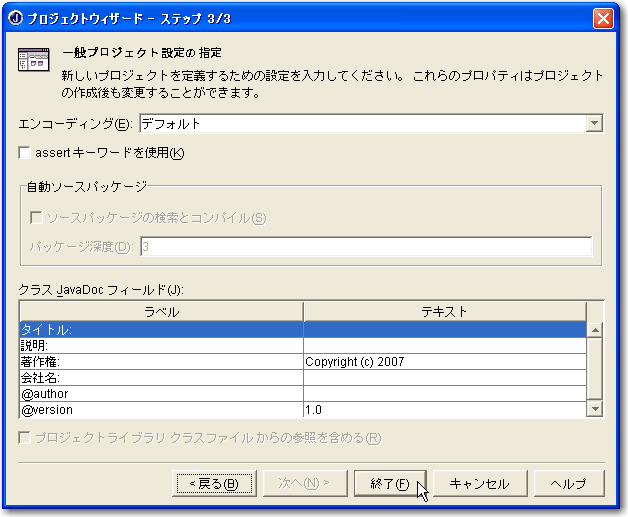 5プロジェクト情報を記載するダイアログボックスになります。これらは、プログラムの実行には関係ありませんが、ファイルの中に残るものです。ここはそのままにして、「終了」ボタンをクリックします。