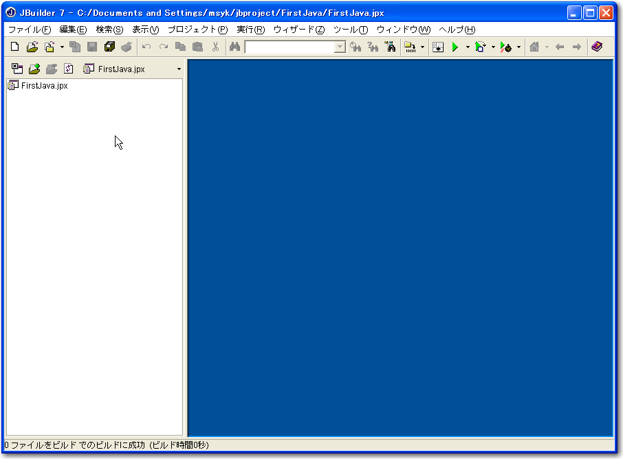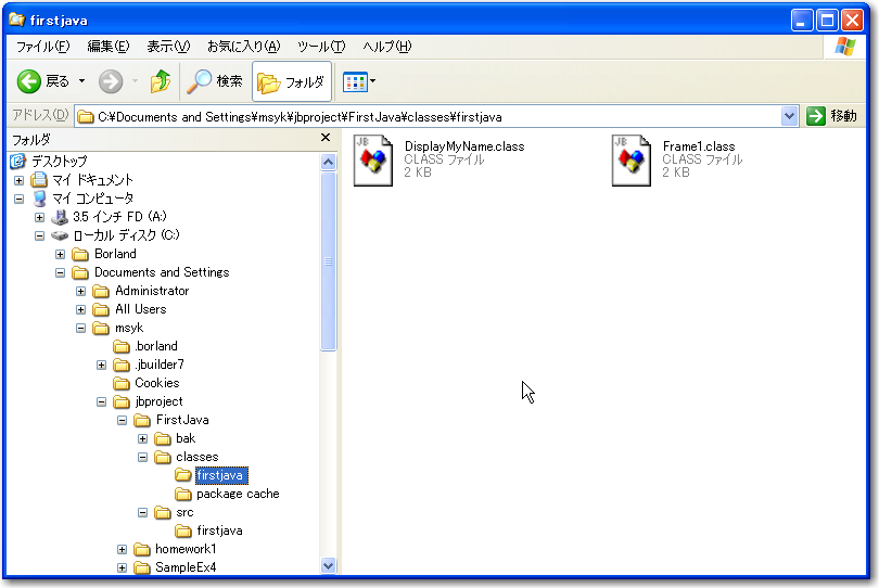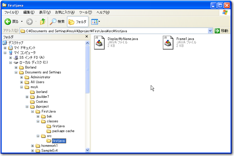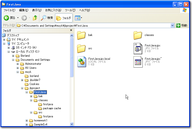 こうしてプロジェクトのファイルが作成されますが、上記の手順だと、そのフォルダは手順3で記述されているディレクトリに作成されます。以上のような流れでは、起動ディスク(ここではC)のホームフォルダ(ここでは、「C:¥Documents and Settings¥msyk」でmsykはログインユーザ名)にjbprojectというフォルダが作られ、そこにFirstJavaフォルダが作られています。(応用情報処理Vの講義を行う状況では、ホームフォルダにjbprojectフォルダが作られるはずです。)ファイルのありかは確認しておくと良いでしょう。