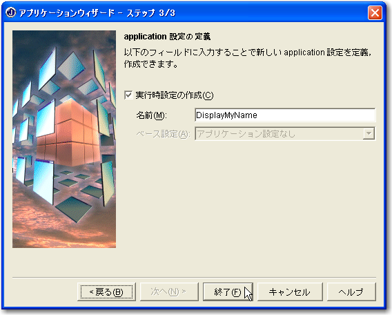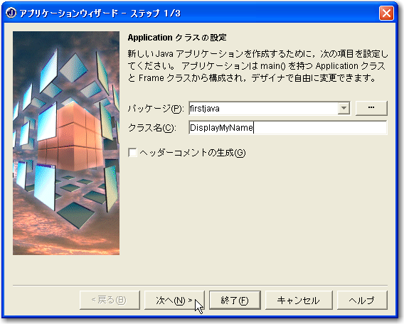2 「アプリケーションウィザード」が起動します。最初のダイアログボックスでは、「クラス」として、「DisplayMyName」をキータイプします。その他の設定については、変更しないで「次へ」ボタンをクリックしてください。(ここで「終了」ボタンをクリックして、以下の手順を飛ばしてもかまいません。)