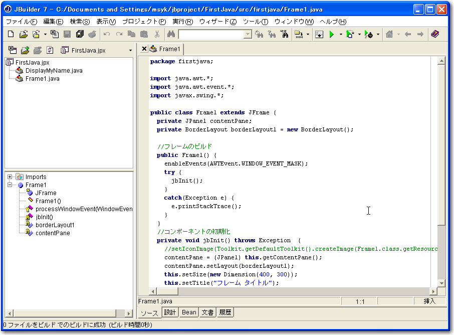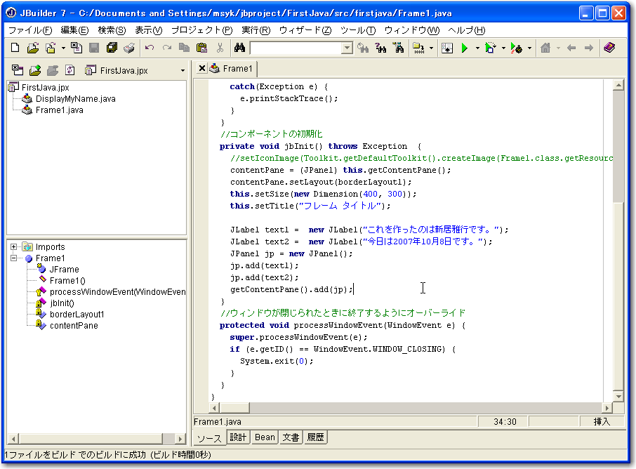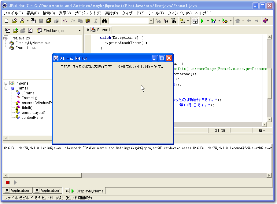 左側の「プロジェクト」ペインでは、FirstJava.jpxの下に項目が加わっていますが、ここで、2つのファイルがあります。ここでは、Frame1.javaだけを修正しました。なぜ2つのファイルがあるのかということなどは追々説明しますが、ウインドウを表示するのがFrame1、アプリケーション全体の管理をするのがここでのDisplayMyName.javaと考えておけばよいでしょう。