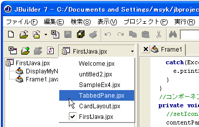 別の機会にJBuilderを起動した場合、通常は終了時に開いていたプロジェクトが再度開かれますので、そのままプログラム作業の続きに取りかかれます。今後、たくさんのプロジェクトを切り替えて使うという状況になった場合には、プロジェクトペインのツールバーにある、プロジェクトファイル名の見えている部分がドロップダウンリストになりますので、過去に開いたことがあるプロジェクトはここにリストとして項目が出てきます。