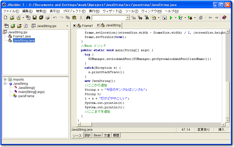 String s = "今日のサンプルはシンプル"; String t; t = s + "だけどややこしい"; System.out.println(s); System.out.println(t);