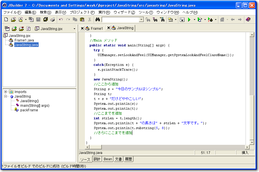 JavaString.javaのこれまでにプログラムを追加してきた部分に引き続いて、部分に次のようなプログラムを追加して、保存、コンパイル、実行としてみてください。