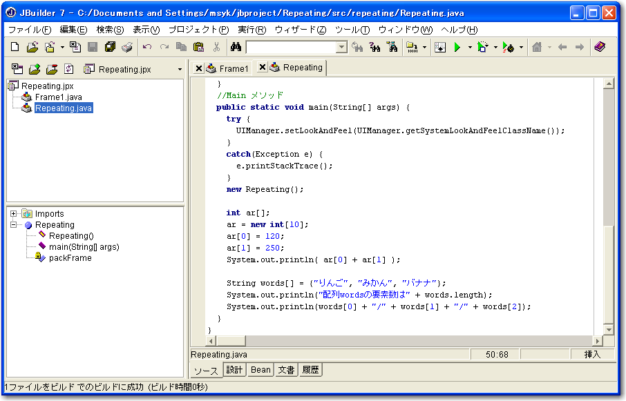 whileとforを使ったプログラムとして、次のようなプログラムを、Repeating.javaの最後の方に追加して実行をしてみてください。ここでもwhileとforで同じことをしています。繰り返し処理と同時に、配列とその要素を繰り返して処理するといった状況になっていることを理解してください。標準出力への出力結果は、少し凝ったことをしてみました。記号を間違えないように入力し、実際にどのような文字列がつながった結果として表示されるのかを具体的に追ってみて下さい。