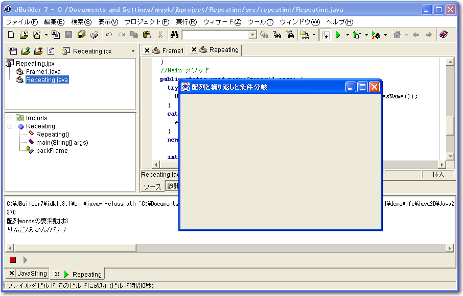 それではifを使ったプログラムを実行してみましょう。やはり以下のプログラムを、Repeating.javaの最後に追加して実行してみます。結果は、やはりメッセージペインで確認します。