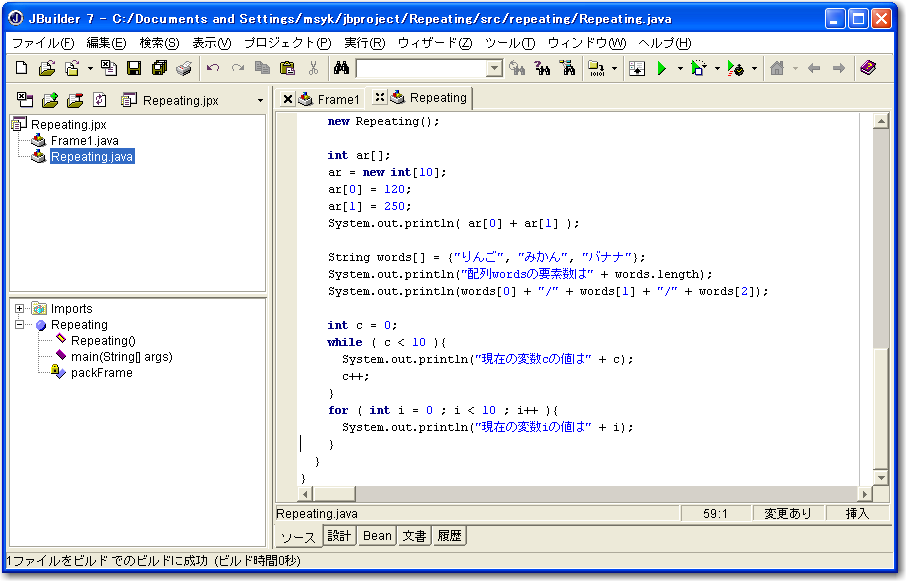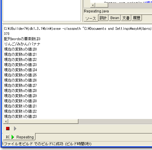 それでは、Repeating.javaのpublic static void mainのブロックの最後の部分に以下のプログラムを追加して実行してみてください。