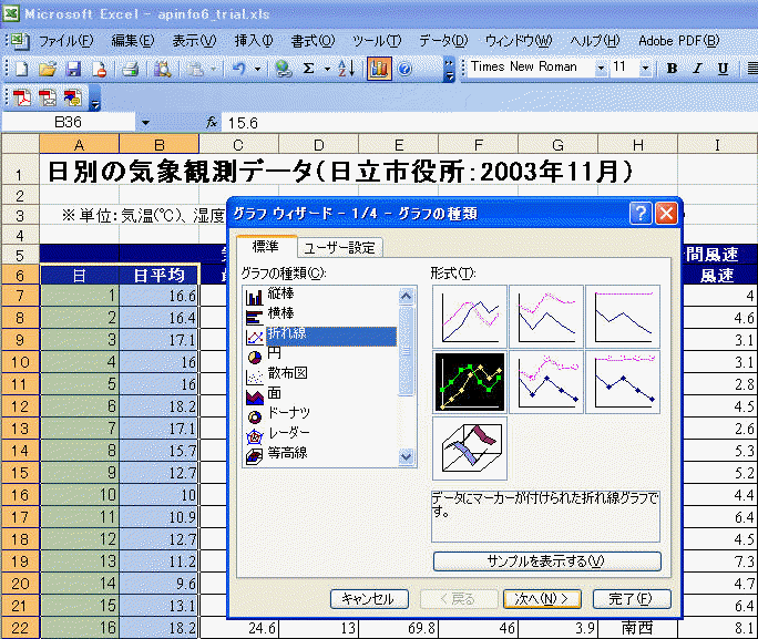 A列とB列のデータでグラフを描くので、ワークシートはとりあえずそのままでいいのですが、この場合A5:A6のセルが結合されており、6行目以降のAとB列を選択するということができません。その場合、A5:A6のセルを選択して、「書式」メニューの「セル」を選び、さらに「配置」のタブを選択して、「セルを結合する」のチェックをはずしてセル結合をやめます。A6に「日」と文字を入れておきました。