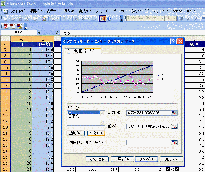 「日平均」つまりB列の系列だけが残ります。さらに、「項目軸ラベルに使用」という設定箇所で、A列のデータ、つまり範囲としては、A7:A36を指定します。