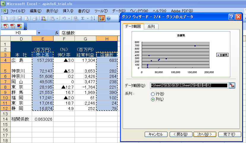 今日のデータのサンプルを利用して相関係数を求める。売上高と店舗数の相関係数を求めてみよう。また、この関係をグラフ(散布図)に描いてみよう。