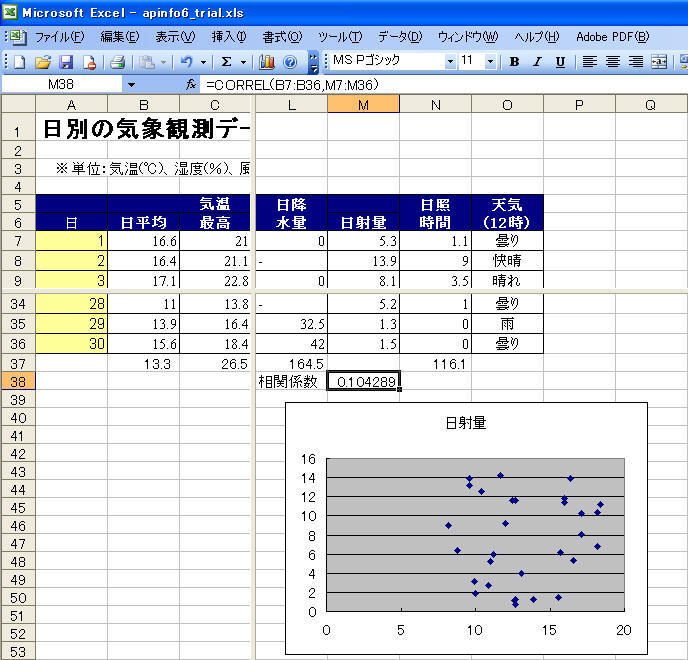 日射量と平均気温の相関係数を求めてみる。散布図も描く。