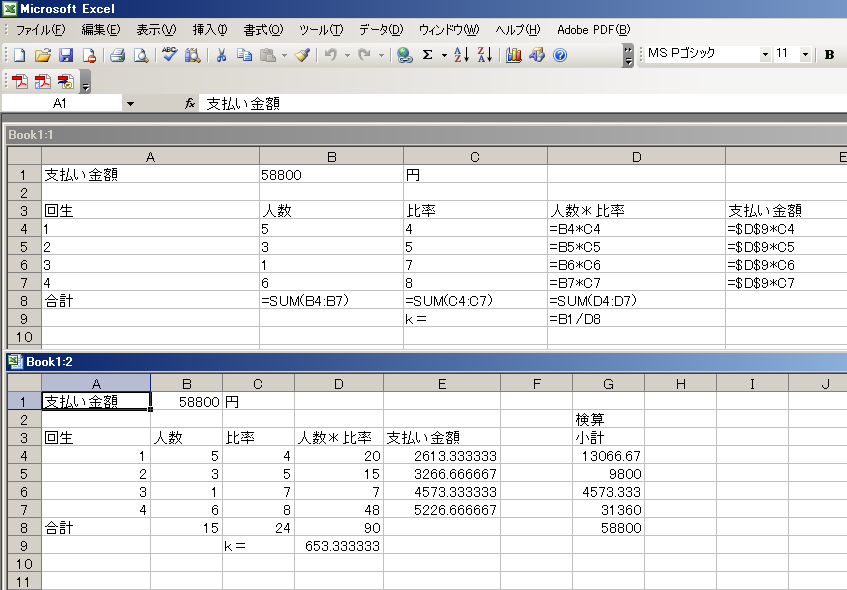 すると、s1+s2+s3+s4=56,870だから、まあ、簡単な1次方程式で、kの値は求まり、一人一人の支払額は決まる。だけど、これをワークシートで展開してみる。
