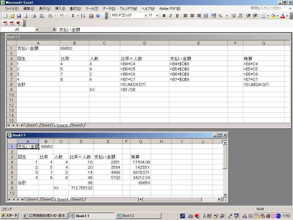 すると、s1+s2+s3+s4=56,870だから、まあ、簡単な1次方程式で、kの値は求まり、一人一人の支払額は決まる。だけど、これをワークシートで展開してみる。