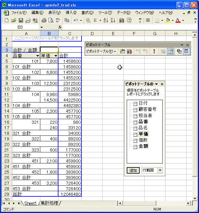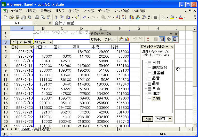ピボットテーブルは、クロス集計の高機能なものです。(クロス集計-一般には2つの分類をそれぞれ縦横に並べて、交差する部分に合計などを記入する。たとえば、商品ごと、担当者ごとの売上が一覧されるような形式。)複雑な集計を一度にできるなかなか便利な機能です。原理を理解し、うまくデータ処理に結び付けてください。