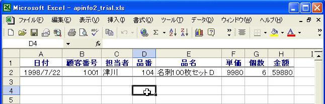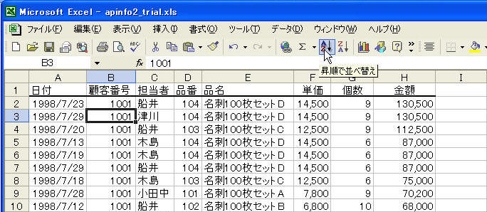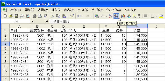 ここで、品番=104、単価=9980の合計金額の「59880」と書かれたセルをダブルクリックすると、以下の図のように、その計算のもとになったデータを別のシートに表示します。つまり、津川が値引きして、1001番の顧客に売ったというのが分かるというわけです。