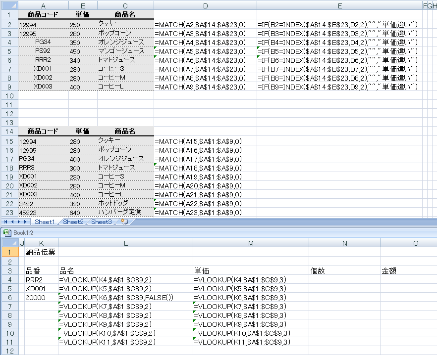 デモでは、A1から始まる表に、もう一方の表に同じ商品があるかどうか、あるなら単価は同じかどうかを判断する式を追加した。もう1つの表にも同じ式を付け加えること。このとき、最終的な表示結果は「ない」「あるが単価は違う」「あって単価も同じ」のいずれかの文字列を表示すること