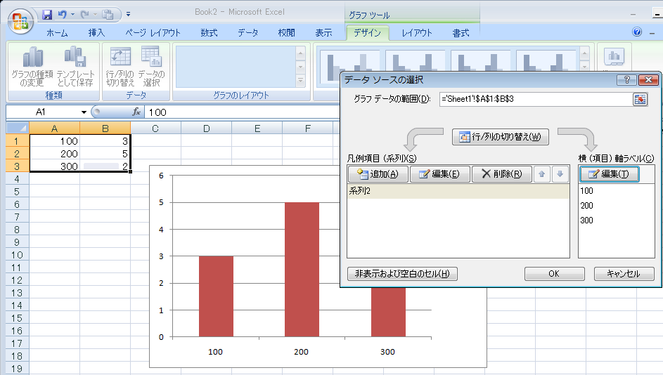 Excel 2007で系列を修正する方法はたとえば次のように行います。A1:B3にあるようなヒストグラムのデータからグラフを描きます。すると、A列も系列と思ってしまっています。