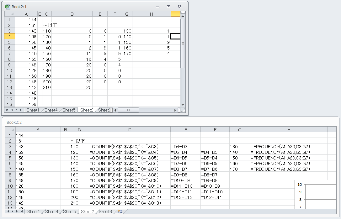 別の方法としては、FREQUENCY関数を使うことです。実際にやってみますが、範囲の指定方法や「配列」として式を入力するなど、ちょっと難しいです。また、値を求める規則についても、注意が必要です。