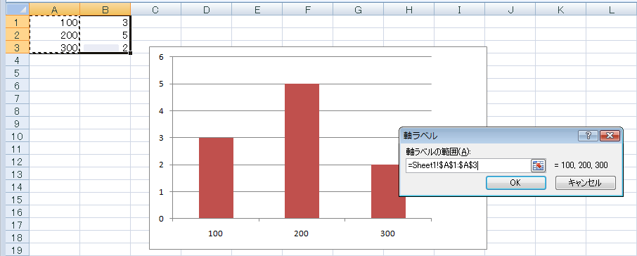 「軸ラベル」というダイアログボックスに変わるので、ラベルが入力されている、A1:A3のセル範囲を選択してOKボタンをクリックします。