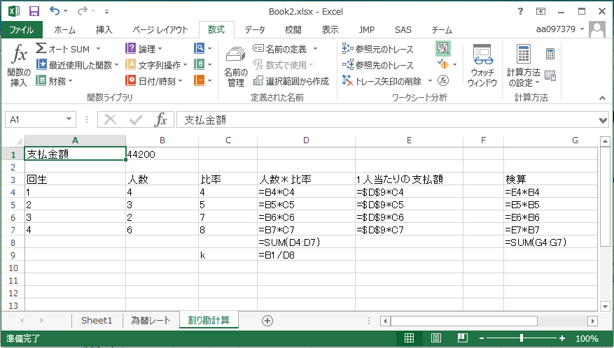 すると、s1+s2+s3+s4=56,870だから、まあ、簡単な1次方程式で、kの値は求まり、一人一人の支払額は決まる。だけど、これをワークシートで展開してみる。