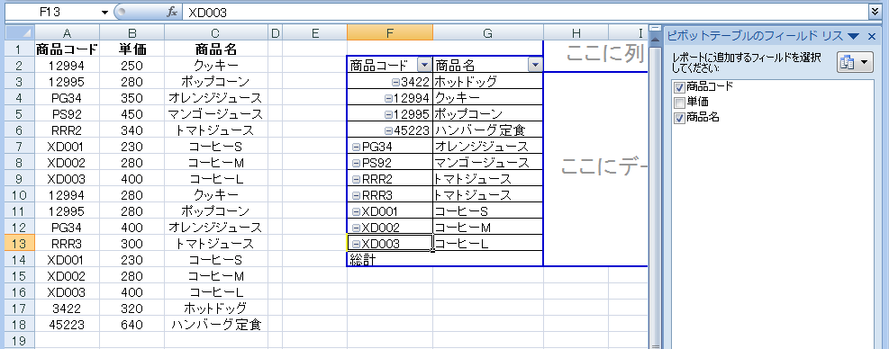 この練習問題はやりようはいろいいろありますが、1つの方法としては、2つ表をまとめてしまい、その表に対してピボットテーブルを作り、列ラベルに「商品番号」「商品名」を両方並べる事です。ですが、このままでは小計が表示されているので、図のようにピボットテーブル内の「商品コード」の列の中を右クリックして「“商品コード”の小計」のチェックを外し、小計表示をやめます。すると、後の図のようになり、あとは適当にコピー&ペーストしてきれいな表に仕上げるなどの作業を行えばいいでしょう。ここでオレンジジューズに異なる2つの商品コードがあることも分かるわけです(これをなんとかすることはやりようがないので、そのままでいいでしょう)。