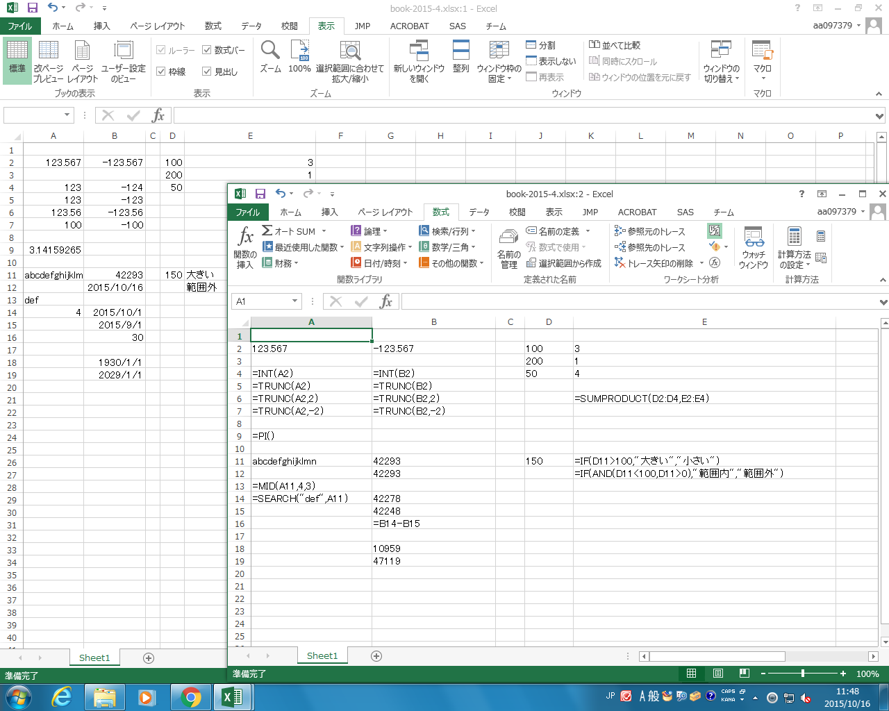 練習問題4-1〜4-4については以下の通りです。まず、正解はこれ1つではありません。ここの回答も状況に不正解になる可能性もあります。100%の解答が常にあるとは限りません。特に、21世紀から何日目かを求める解答については、「1秒追加」するのはやりすぎかもしれませんが、ここではROUNDUP関数をともかく使うということを優先してこうしました。なぜ、1秒追加するのかは、0時0分0秒で間違いが発生するからです。また、姓名から名前を取り出す場合、RIGHT関数でももちろんかまいませんが、MID関数を使えば「最初の空白より後の文字すべて」という取り出し方ができます。取り出す長さをLEN関数で求めている点にも注意を払いましょう。4-3はちょっと難しいですが、こういう場合は途中の結果を順次セルに分けると分かりやすいかもしれません。ポイントは、C19のセルのIF文でしょう。もちろん、OR関数を思いついたかもしれませんが、ここでは「スペースがない」「半角である」「全角である」の3通りにしかならないことを考え、それぞれの場合でどの値が欲しいのかを考えてみると、これが1つの解答になるでしょう。