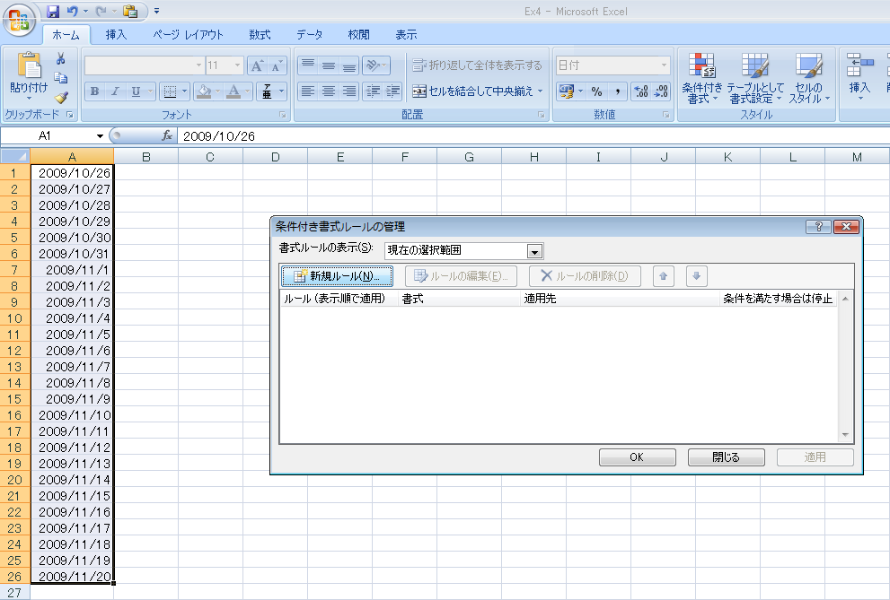 練習問題4-4はいきなり「条件付き書式」をやってもらいました。ある意味、こうした機能は習うより慣れろ…なんではありますが、Excel 2007のこの機能はいきなり使えと言われても分かりにくいと思いますので、手順を示します。条件付き書式は、セルの書式を条件に応じて設定するという機能ですが、ここでは条件が「100以上」とかいったシンプルなものではなく、WEEKDAY関数の結果をもとに考えないといけないという点があります。そして、そのときに設定する式のセル参照の方法をどうすればいいのかということも問題になるでしょう。