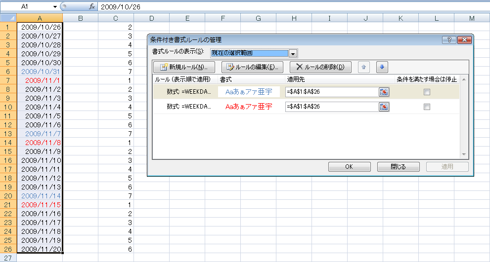 土曜なら青になるという設定も、同じ手順で追加します。もちろん,式は「=WEEKDAY(A1)=7」です。ちなみに、最初の=を忘れると、全体を文字列と見なして、正しく計算されません(もちろん、日曜日の判定も同様です)。「適用」をクリックすると、OKでダイアログボックスを消さなくても結果を見る事ができます。