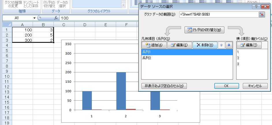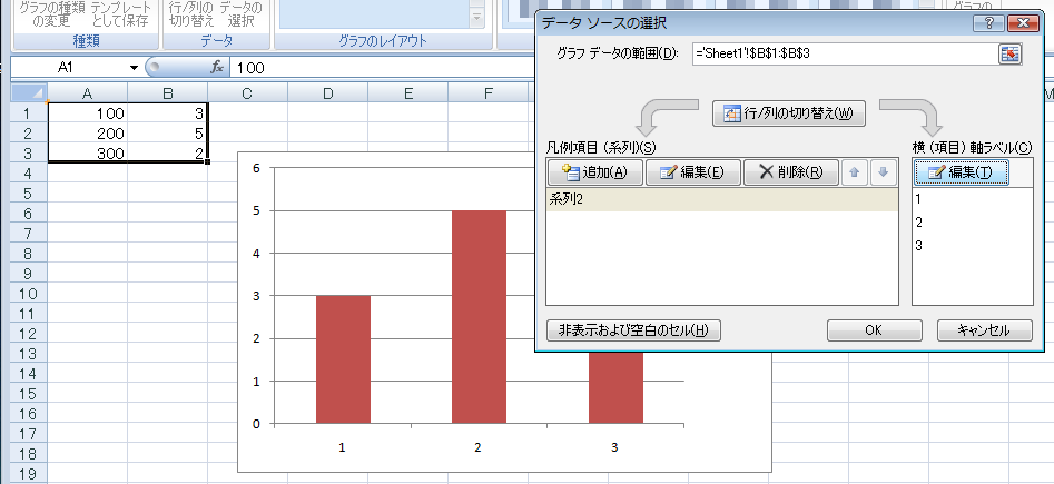 Excel 2007で系列を修正する方法はたとえば次のように行います。A1:B3にあるようなヒストグラムのデータからグラフを描きます。すると、A列も系列と思ってしまっています。