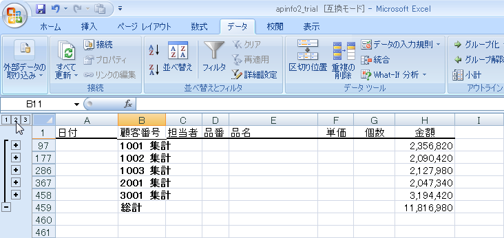 一定の条件にしたがって、データを集計することができます。集計結果は「アウトライン」という機能で、要約的な表示にしたり、詳細を含めた表示にすることができます。集計処理の方法と、アウトラインの使い方を説明します。