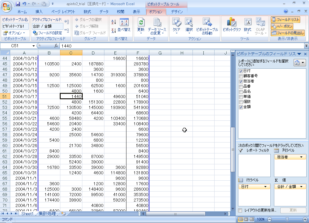 ピボットテーブルは、クロス集計の高機能なものです。(クロス集計-一般には2つの分類をそれぞれ縦横に並べて、交差する部分に合計などを記入する。たとえば、商品ごと、担当者ごとの売上が一覧されるような形式。)複雑な集計を一度にできるなかなか便利な機能です。原理を理解し、うまくデータ処理に結び付けてください。