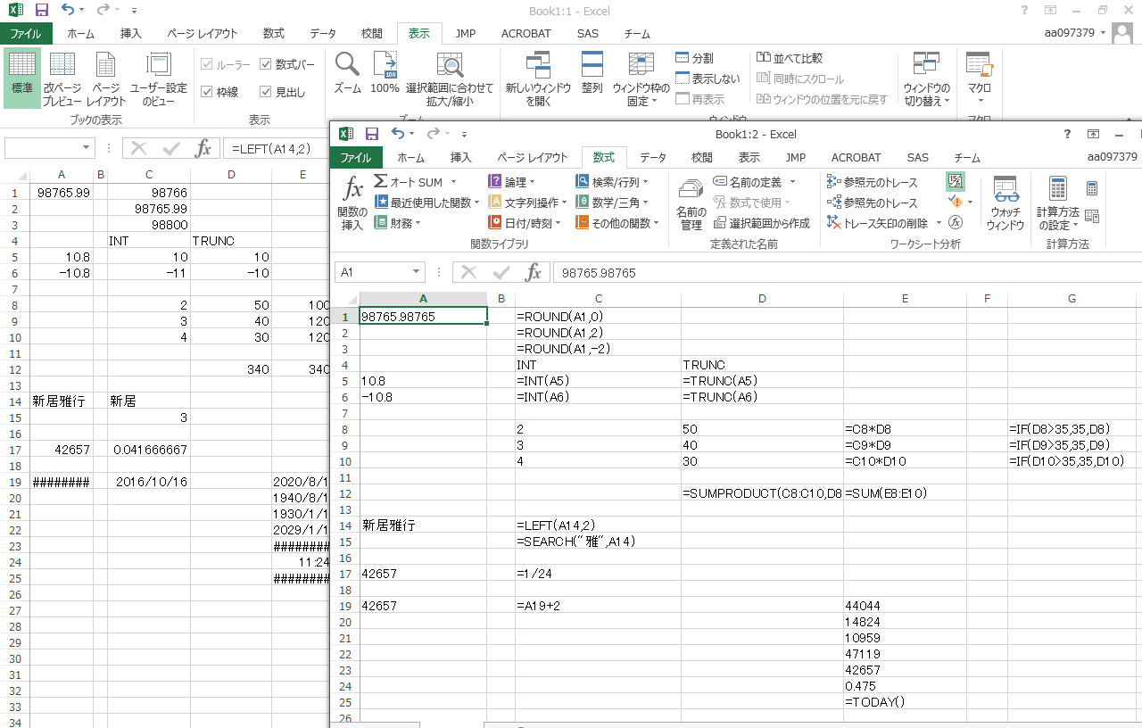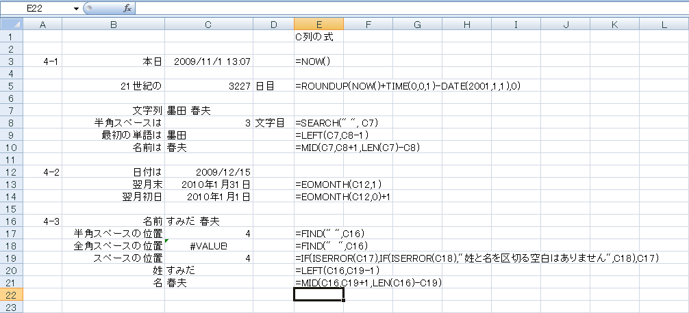 練習問題4-1〜4-4については以下の通りです。まず、正解はこれ1つではありません。ここの回答も状況に不正解になる可能性もあります。100%の解答が常にあるとは限りません。特に、21世紀から何日目かを求める解答については、「1秒追加」するのはやりすぎかもしれませんが、ここではROUNDUP関数をともかく使うということを優先してこうしました。なぜ、1秒追加するのかは、0時0分0秒で間違いが発生するからです。また、姓名から名前を取り出す場合、RIGHT関数でももちろんかまいませんが、MID関数を使えば「最初の空白より後の文字すべて」という取り出し方ができます。取り出す長さをLEN関数で求めている点にも注意を払いましょう。4-3はちょっと難しいですが、こういう場合は途中の結果を順次セルに分けると分かりやすいかもしれません。ポイントは、C19のセルのIF文でしょう。もちろん、OR関数を思いついたかもしれませんが、ここでは「スペースがない」「半角である」「全角である」の3通りにしかならないことを考え、それぞれの場合でどの値が欲しいのかを考えてみると、これが1つの解答になるでしょう。