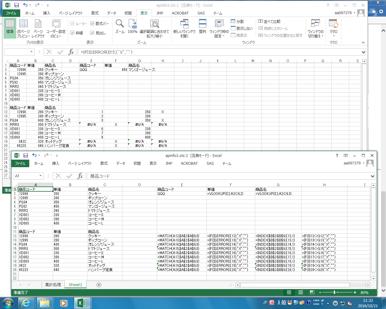 デモでは、A1から始まる表に、もう一方の表に同じ商品があるかどうか、あるなら単価は同じかどうかを判断する式を追加した。もう1つの表にも同じ式を付け加えること。このとき、最終的な表示結果は「ない」「あるが単価は違う」「あって単価も同じ」のいずれかの文字列を表示すること
