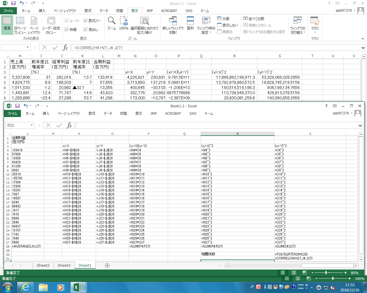 今日のデータのサンプルを利用して相関係数を求める。売上高と当期利益の相関係数を求めてみよう。また、この関係をグラフ(散布図)に描いてみよう。