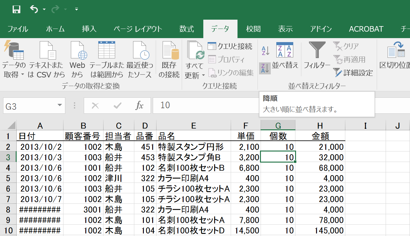 個数の多いものから順に並べ替える。個数が入力されているG列のいずれかのセルを選択して、「並べ替えとフィルター」グループにある「降順」ボタンをクリックする。