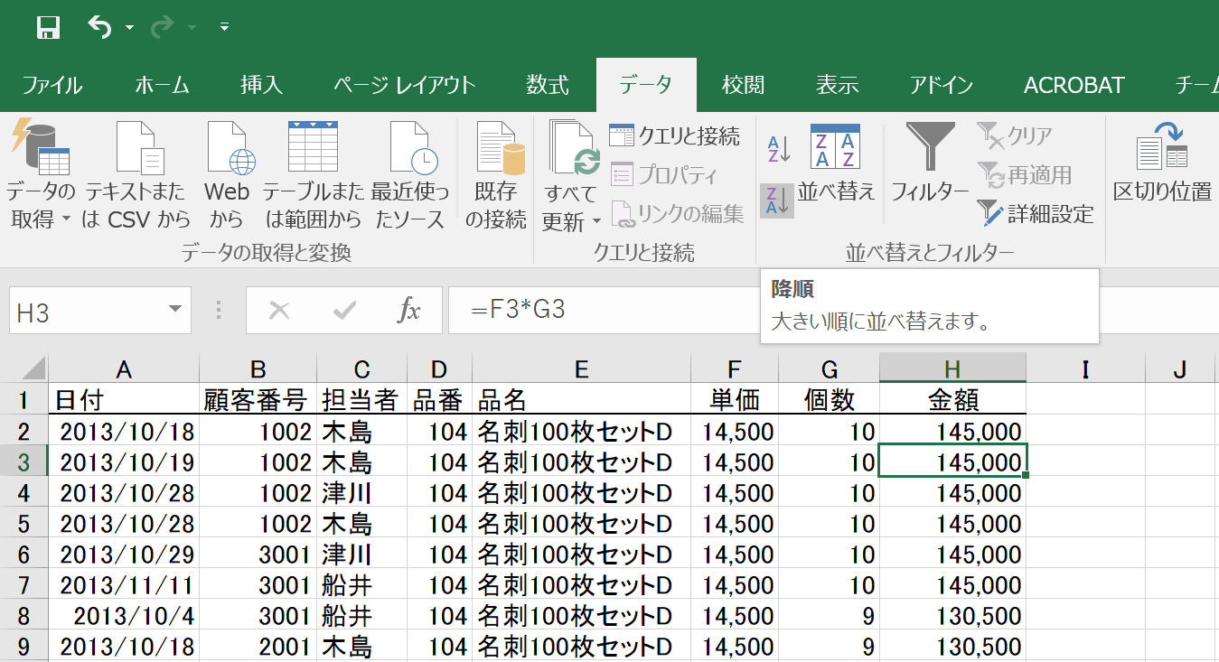 金額の多いものから順に並べる。金額が入力されているH列のいずれかのセルを選択して、「並べ替えとフィルター」グループにある「降順」ボタンをクリックする。