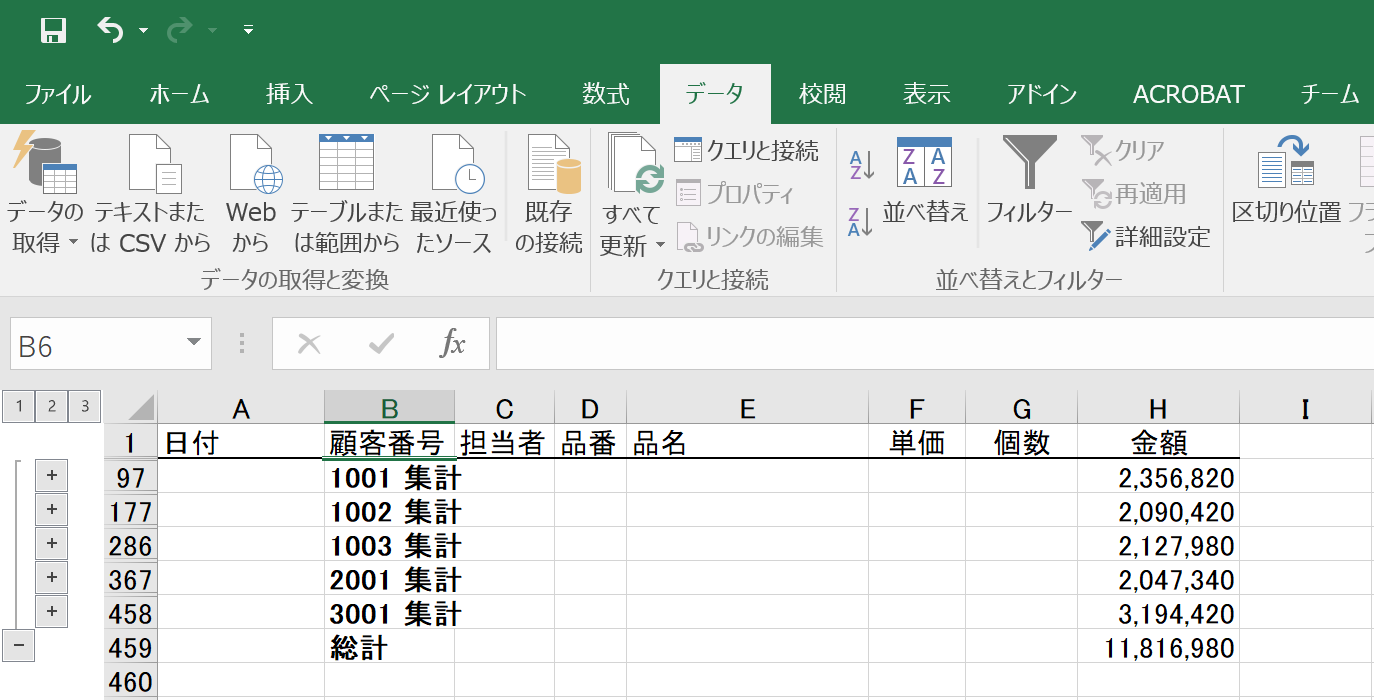 顧客ごとの合計が表示されている。アウトラインの「2」ボタンをクリックして、合計だけを表示した。