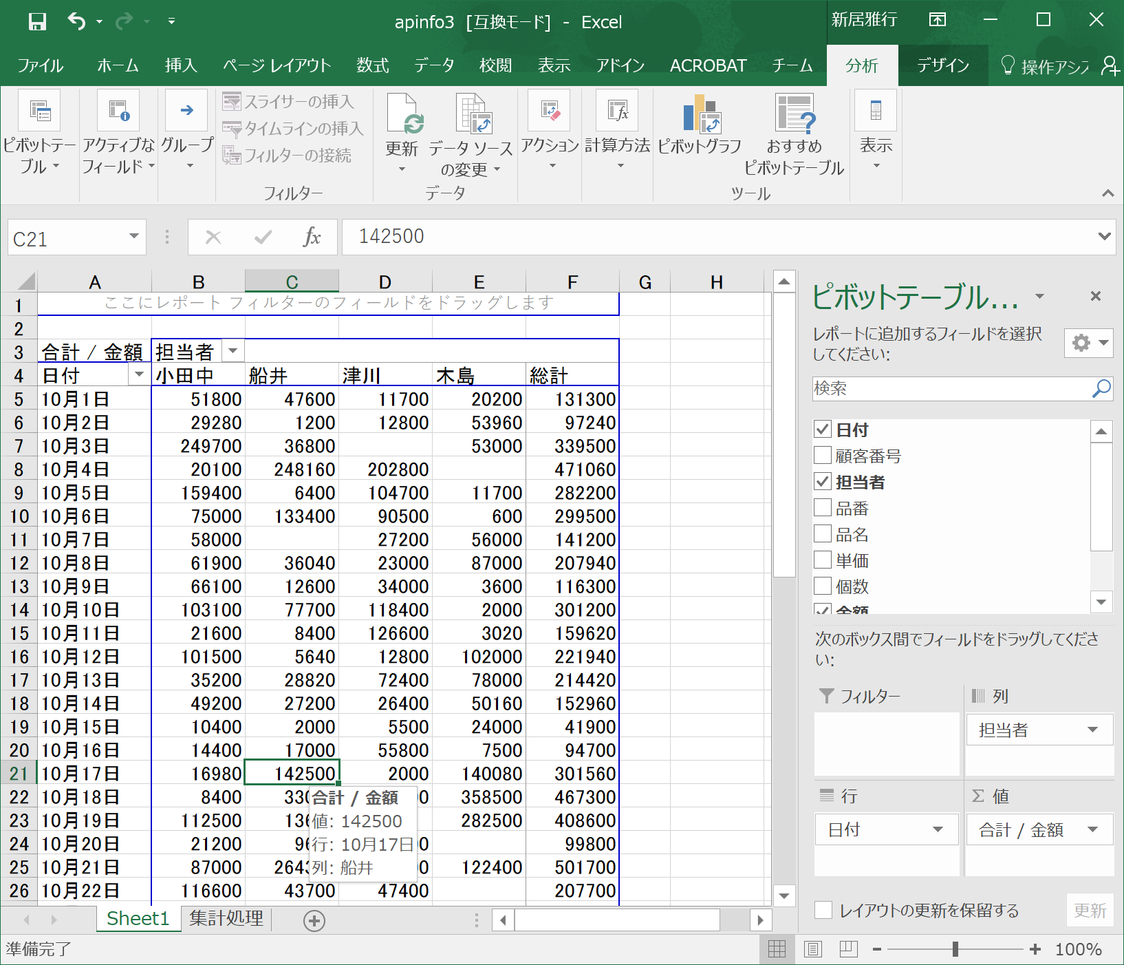 ところで10月17日の船井の合計売上金額はいくらか? (などと、ピボットテーブルの結果をきちんと読み取ることができるように)