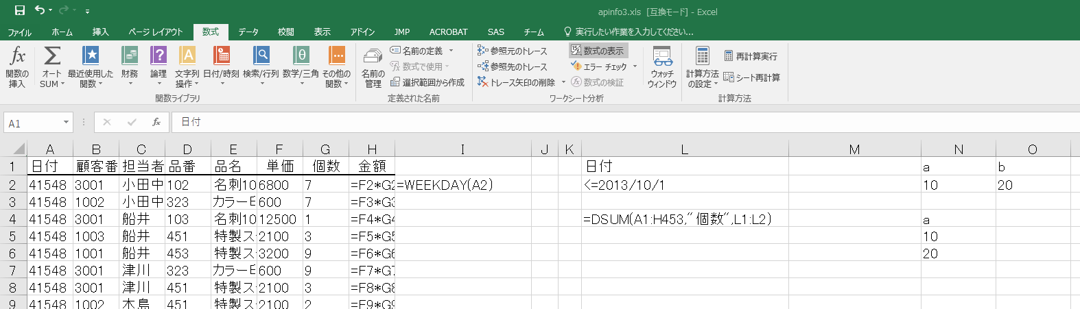 第3回のワークシートにあるデータを利用して、データベース関数を使って集計をすること。担当者ごとの10月の期間だけの売上表を作成すること。最終的には担当者ごとの表になっていればいいので、それ以外の部分は自由にセルを利用してかまわない。