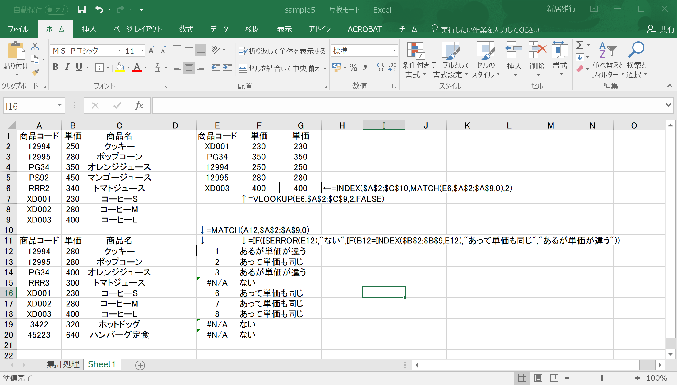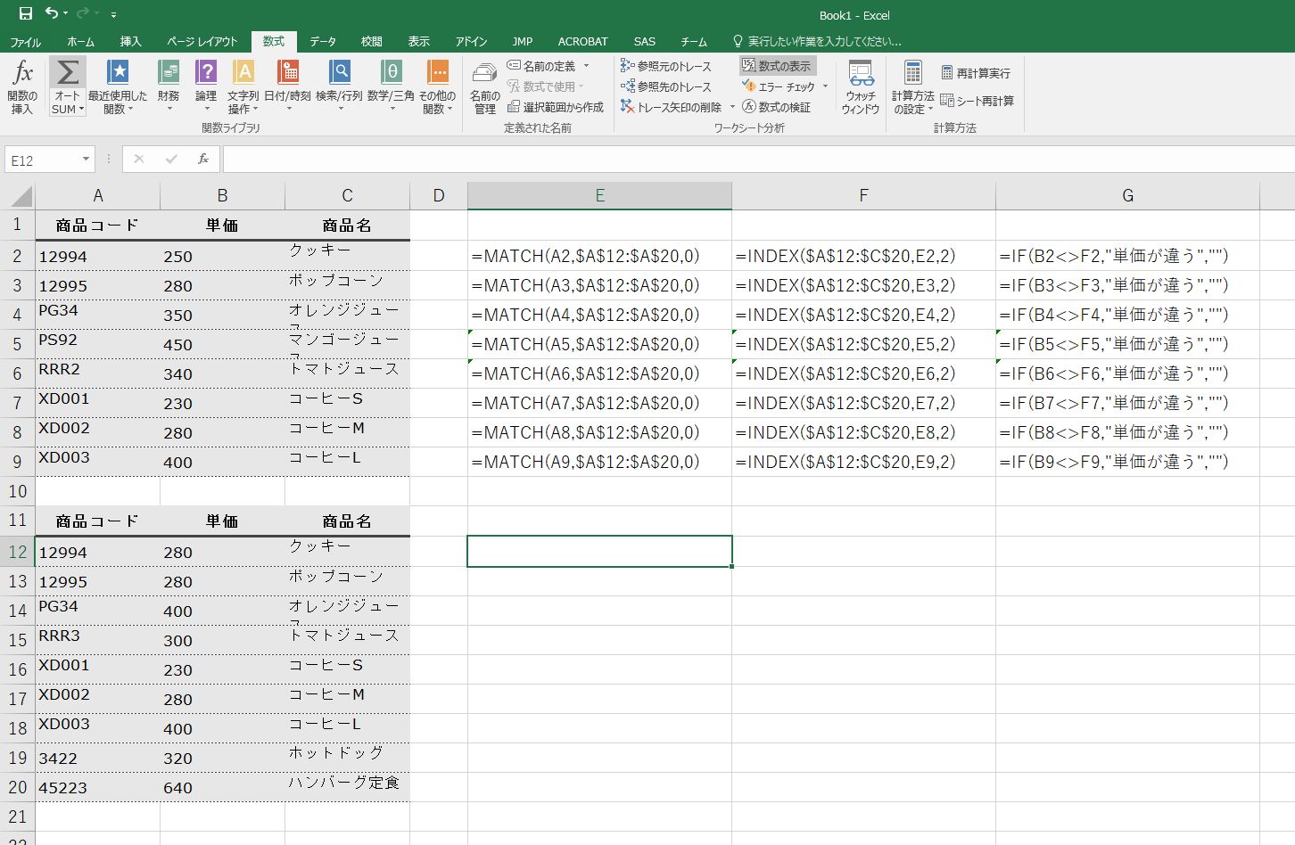 デモでは、A1から始まる表に、もう一方の表に同じ商品があるかどうか、あるなら単価は同じかどうかを判断する式を追加した。もう1つの表にも同じ式を付け加えること。このとき、最終的な表示結果は「ない」「あるが単価は違う」「あって単価も同じ」のいずれかの文字列を表示すること