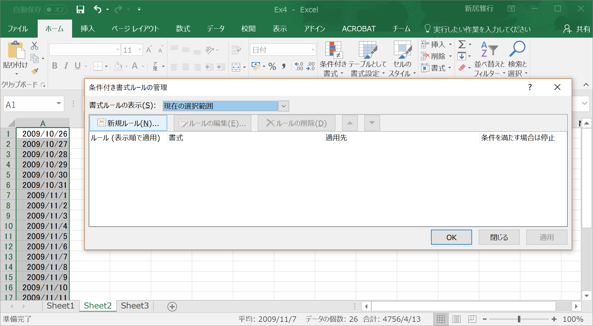 まず、日付が入力されたセルを選択しておいて、「ホーム」タブの「スタイル」にある「条件付き書式」をクリックしてメニューを表示し、「ルールの管理」を選択します。