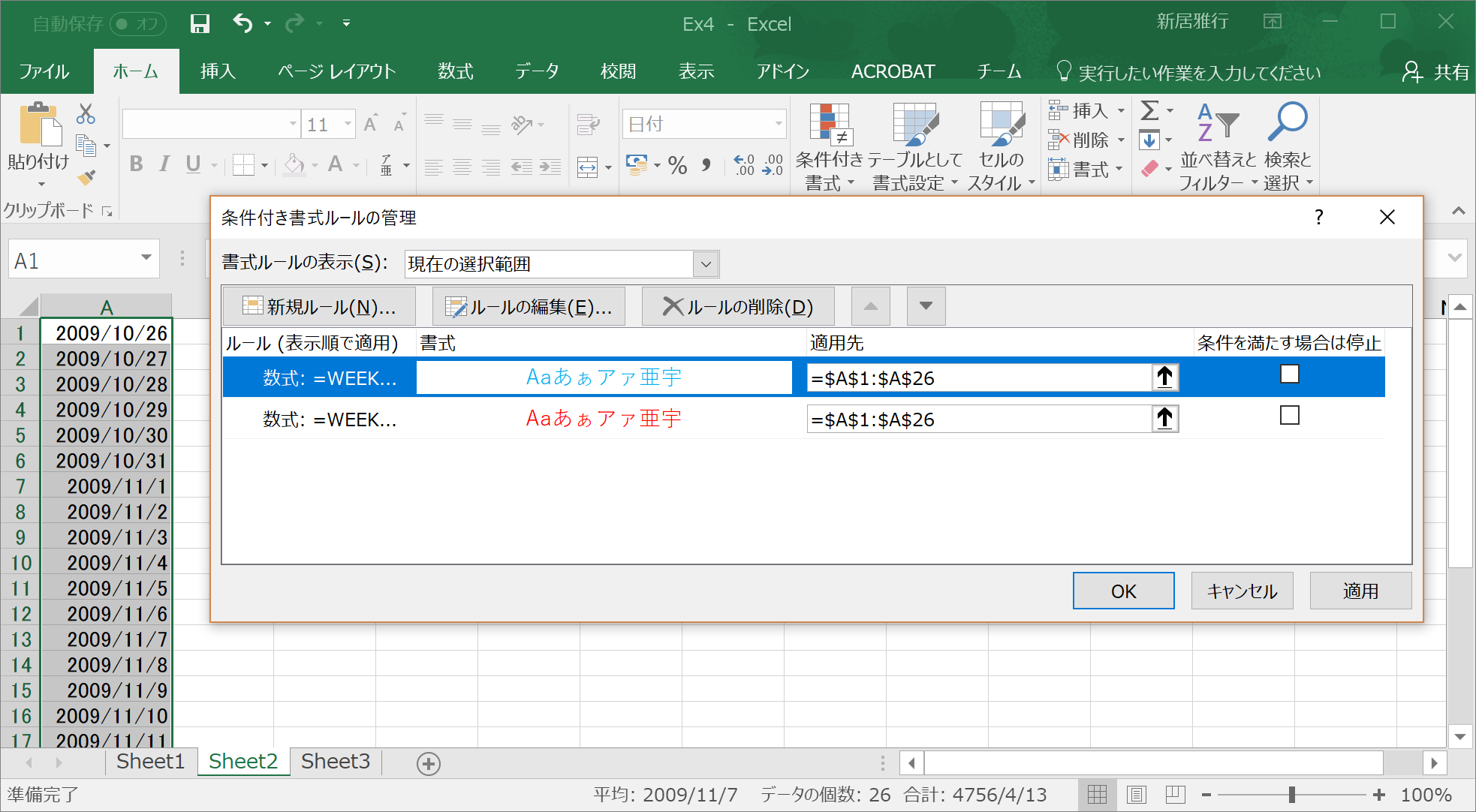 土曜なら青になるという設定も、同じ手順で追加します。もちろん,式は「=WEEKDAY(A1)=7」です。「適用」をクリックすると、OKでダイアログボックスを消さなくても結果を見る事ができます。