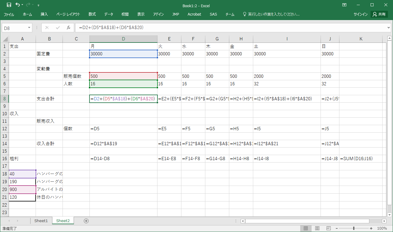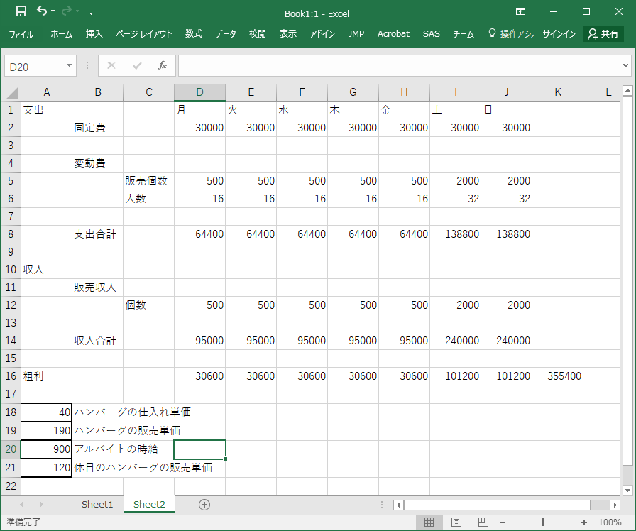 事例2の店では、ドリンクも販売している。ここでは話を簡単にするためにドリンクは1種類だけ販売されているとする。値段や仕入れ単価は適当に販売すること。普通はハンバーグに加えてドリンクを買うのが普通だと思われる。ハンバーグの販売個数に対するドリンクの割合をセルで指定できるようにする(つまり、ハンバーグ2個あたりドリンク1なのかという数値をセルで指定する。たとえば、ハンバーグ1.5個に対してドリンクが1だという仮定などができるようにする)。そして、ドリンクを販売する効果をシミュレーションしてみよう。数値などは、想像力を働かせて自分で思った数値を入れてみよう。