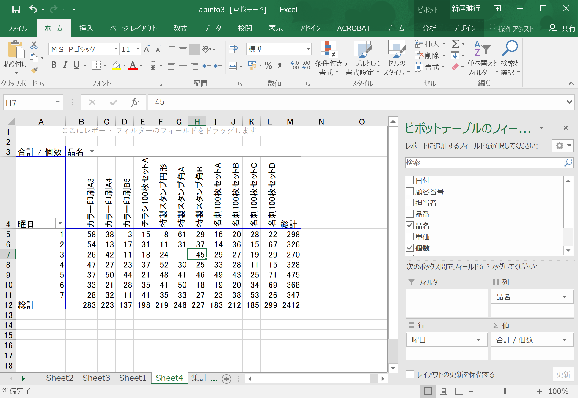 曜日ごとに、各商品が何個ずつ販売されたのかを集計したい。ピボットテーブルを使えばいい。1.5ヶ月分しかないのでちょっとつまらん結果だがいいとしよう