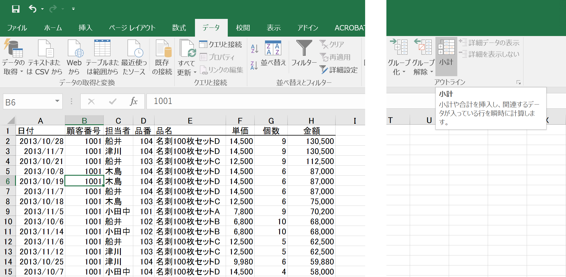 まず、顧客番号順に並び替える。顧客番号が入力されているB列のいずれかのセルを選択して、「並べ替えとフィルター」グループにある「昇順」ボタンをクリックする。その後、「アウトライン」グループにある「小計」ボタンをクリックする。