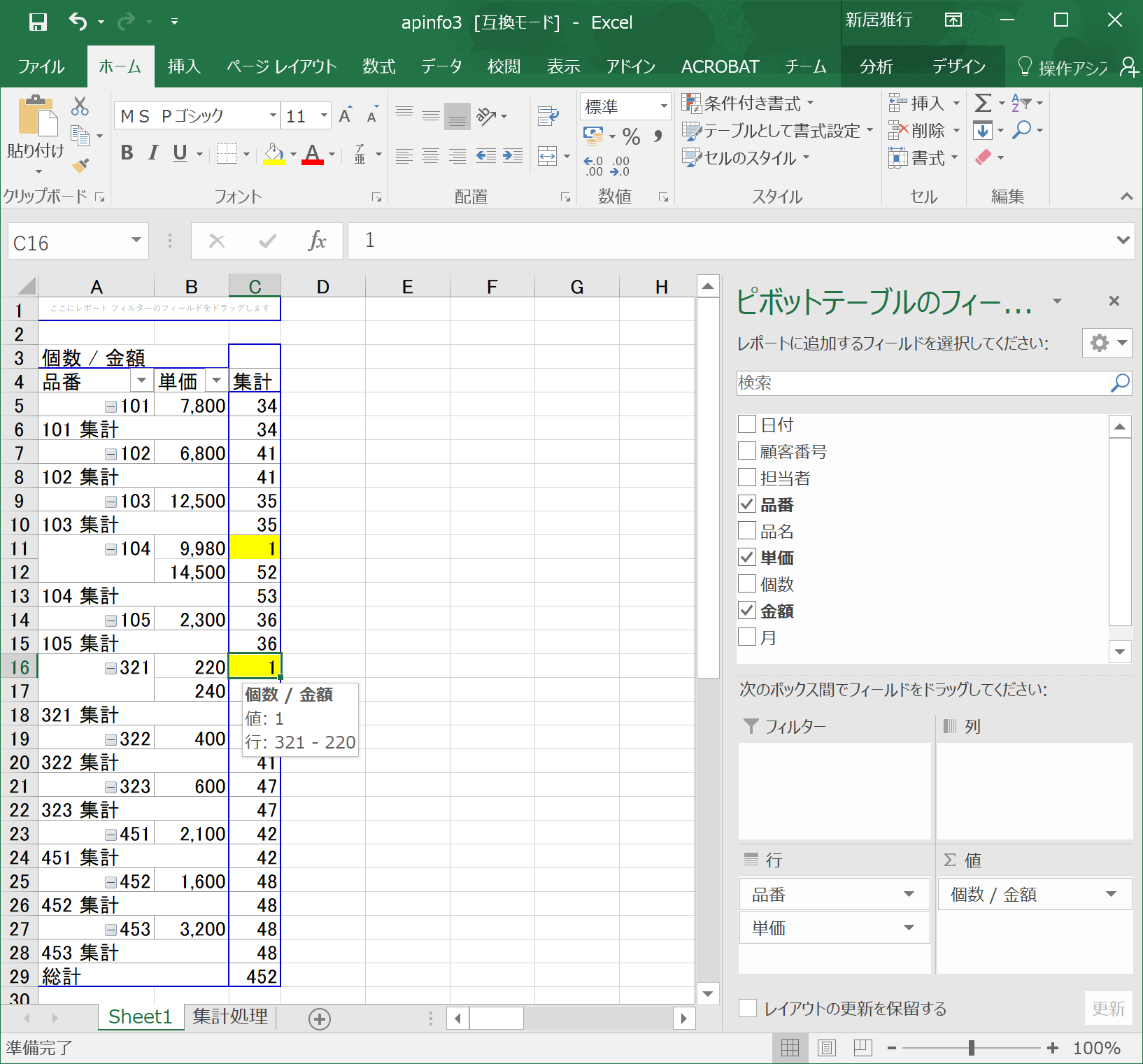 こんなピボットテーブルを作ってみました。たてに品番も単価も並べてあります。ポイントは「単価」を行ラベルあるいは列ラベルに設定するということです。すると、品番が104と321がどうも2種類の単価があるようです。集計結果を「金額」の個数にしてあるので、いずれも1回だけ販売したものであることがわかります。