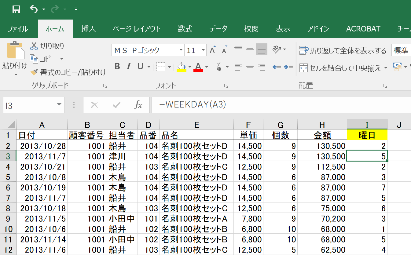 ヒント:A2には日付データが入っている。I2に「=WEEKDAY(A2)」という式を入れてみると、曜日に対応する数値がI列に表示される。