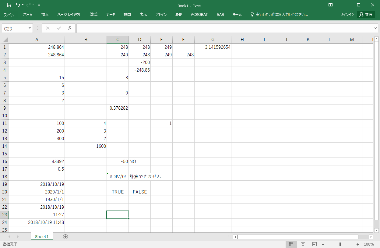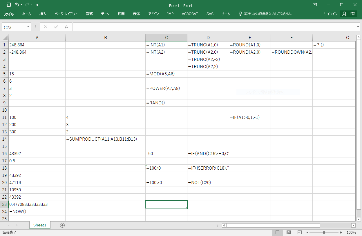 練習問題4-1〜4-3については以下の通りです。まず、正解はこれ1つではありません。ここの回答も状況に不正解になる可能性もあります。100%の解答が常にあるとは限りません。特に、21世紀から何日目かを求める解答については、「1秒追加」するのはやりすぎかもしれませんが、ここではROUNDUP関数をともかく使うということを優先してこうしました。なぜ、1秒追加するのかは、0時0分0秒で間違いが発生するからです。また、姓名から名前を取り出す場合、RIGHT関数でももちろんかまいませんが、MID関数を使えば「最初の空白より後の文字すべて」という取り出し方ができます。取り出す長さをLEN関数で求めている点にも注意を払いましょう。4-3はちょっと難しいですが、こういう場合は途中の結果を順次セルに分けると分かりやすいかもしれません。ポイントは、C19のセルのIF文でしょう。もちろん、OR関数を思いついたかもしれませんが、ここでは「スペースがない」「半角である」「全角である」の3通りにしかならないことを考え、それぞれの場合でどの値が欲しいのかを考えてみると、これが1つの解答になるでしょう。