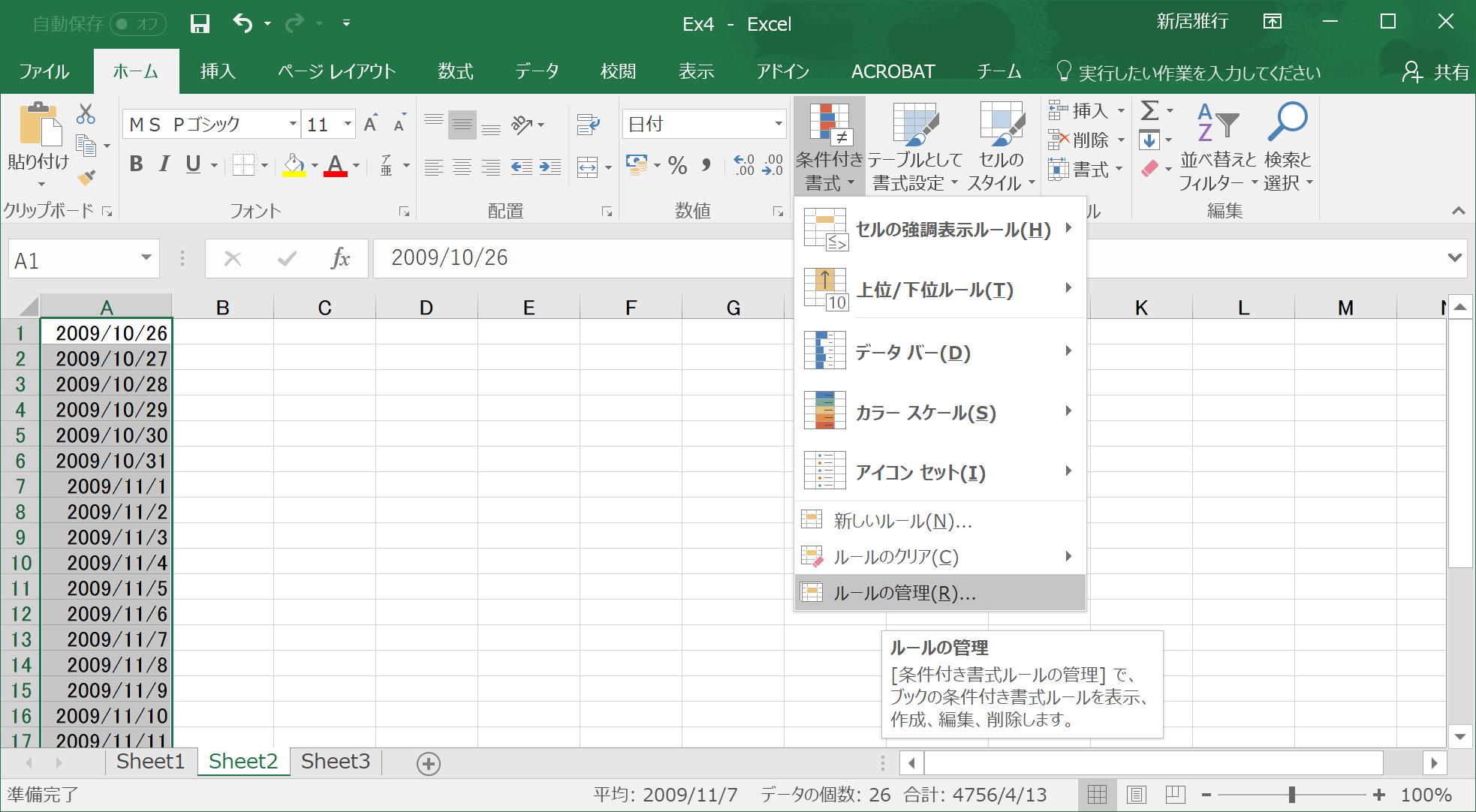 まず、日付が入力されたセルを選択しておいて、「ホーム」タブの「スタイル」にある「条件付き書式」をクリックしてメニューを表示し、「ルールの管理」を選択します。