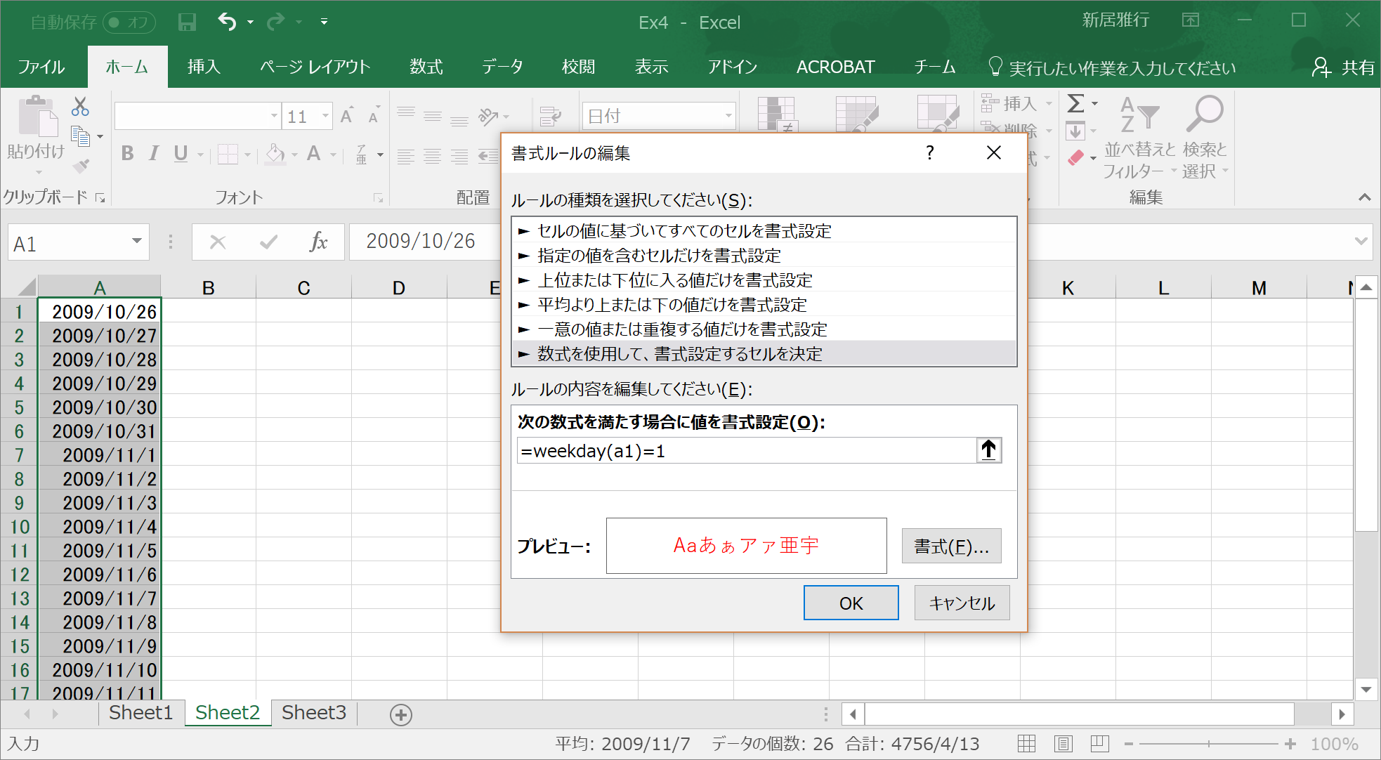 土曜なら青になるという設定も、同じ手順で追加します。もちろん,式は「=WEEKDAY(A1)=7」です。「適用」をクリックすると、OKでダイアログボックスを消さなくても結果を見る事ができます。