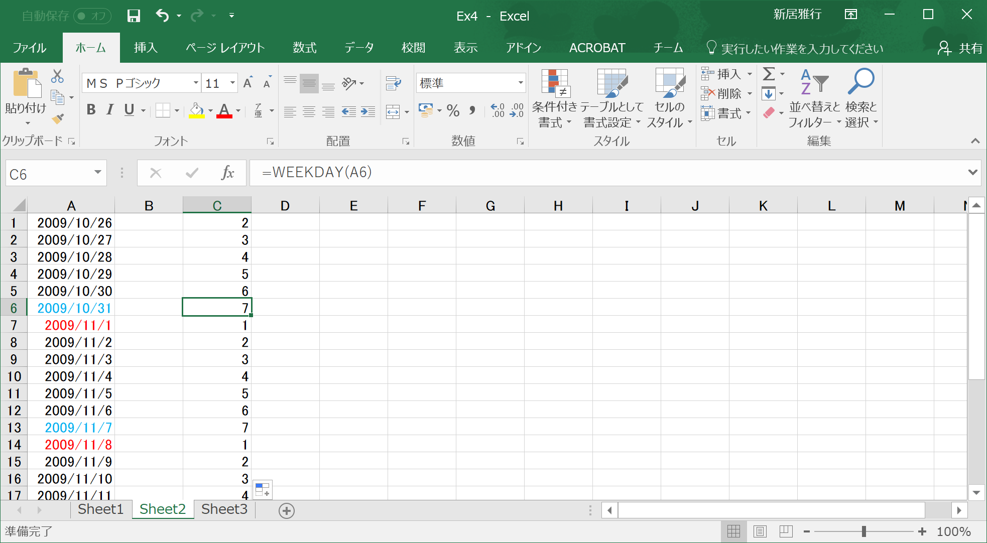 練習問題4-4はいきなり「条件付き書式」をやってもらいました。ある意味、こうした機能は習うより慣れろ…なんではありますが、Excelのこの機能はいきなり使えと言われても分かりにくいと思いますので、手順を示します。条件付き書式は、セルの書式を条件に応じて設定するという機能ですが、ここでは条件が「100以上」とかいったシンプルなものではなく、WEEKDAY関数の結果をもとに考えないといけないという点があります。そして、そのときに設定する式のセル参照の方法をどうすればいいのかということも問題になるでしょう。